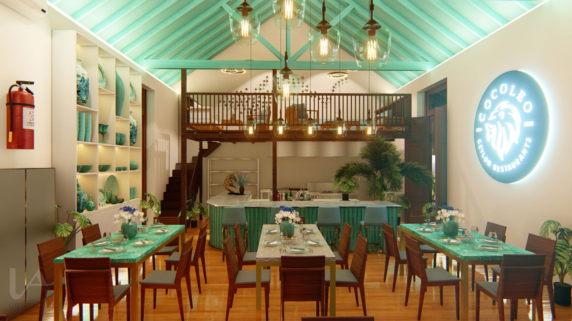 A vibrant seaside dining experience within a historic Dutch Fort. Turquoise ceilings, artistic lighting, and