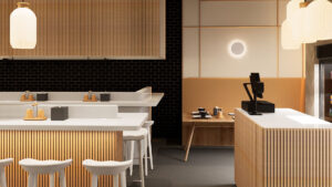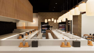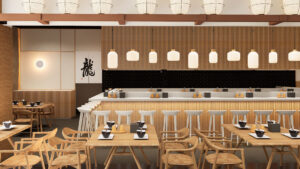 The interiors of RYU Sushi are designed to capture a sense of refined simplicity and atmospheric warmth, blending contemporary elegance with subtle nods to Japanese tradition. Softly glowing Hotaru lanterns are suspended throughout the dining space, casting a gentle, diffused light that creates an intimate and welcoming ambience. Their organic form adds rhythm and softness to the clean architectural lines.