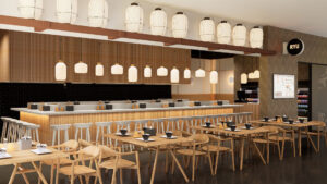 Strategically placed featured lighting highlights key areas — from the sushi bar to private dining zones — drawing focus to the artistry of the cuisine while enhancing the layered mood of the restaurant. Shadows and highlights play across the surfaces, giving the space a dynamic yet calming character.